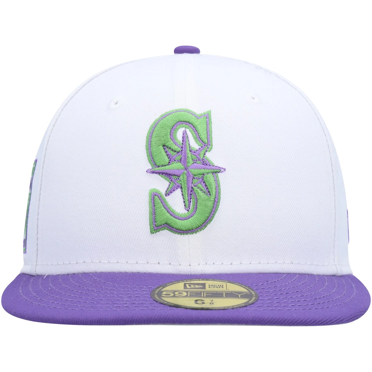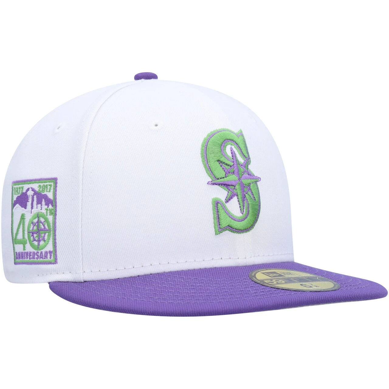 Add a snazzy hat to your lineup of Seattle Mariners gear by grabbing this 40th Anniversary Side Patch 59FIFTY fitted hat from New Era. The purple and green embroidery pops off the solid white panels for a bold addition to any game day look. The fitted construction provides a consistent wear each time you reach for this cap.